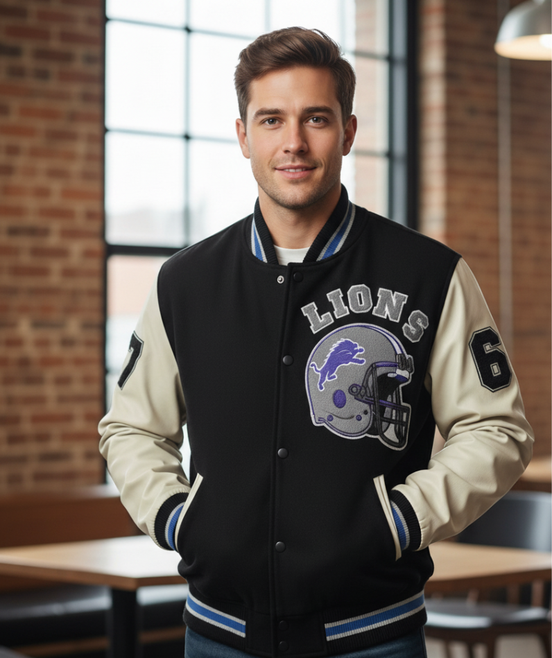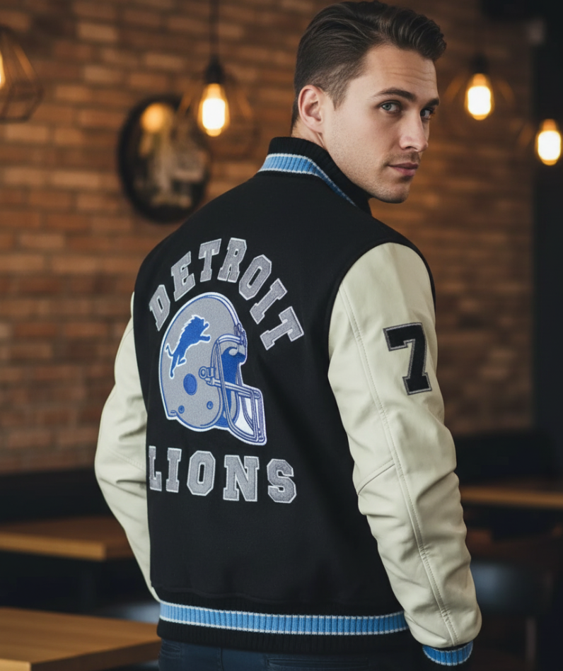 Relive the iconic fashion of the 80s with this Beverly Hills Cop Axel Foley Detroit Lions Jacket. This vintage varsity jacket is a high-quality tribute to the classic outerwear worn by Eddie Murphy in the beloved film. Combining a cozy fleece fabric body with premium Cowhide sleeves (available in genuine sheep Cowhide or faux Cowhide options), this piece offers the perfect blend of retro style, comfort, and authenticity. It’s the ultimate collectible for movie fans and a guaranteed head-turner for anyone who appreciates retro bomber jacket aesthetics.