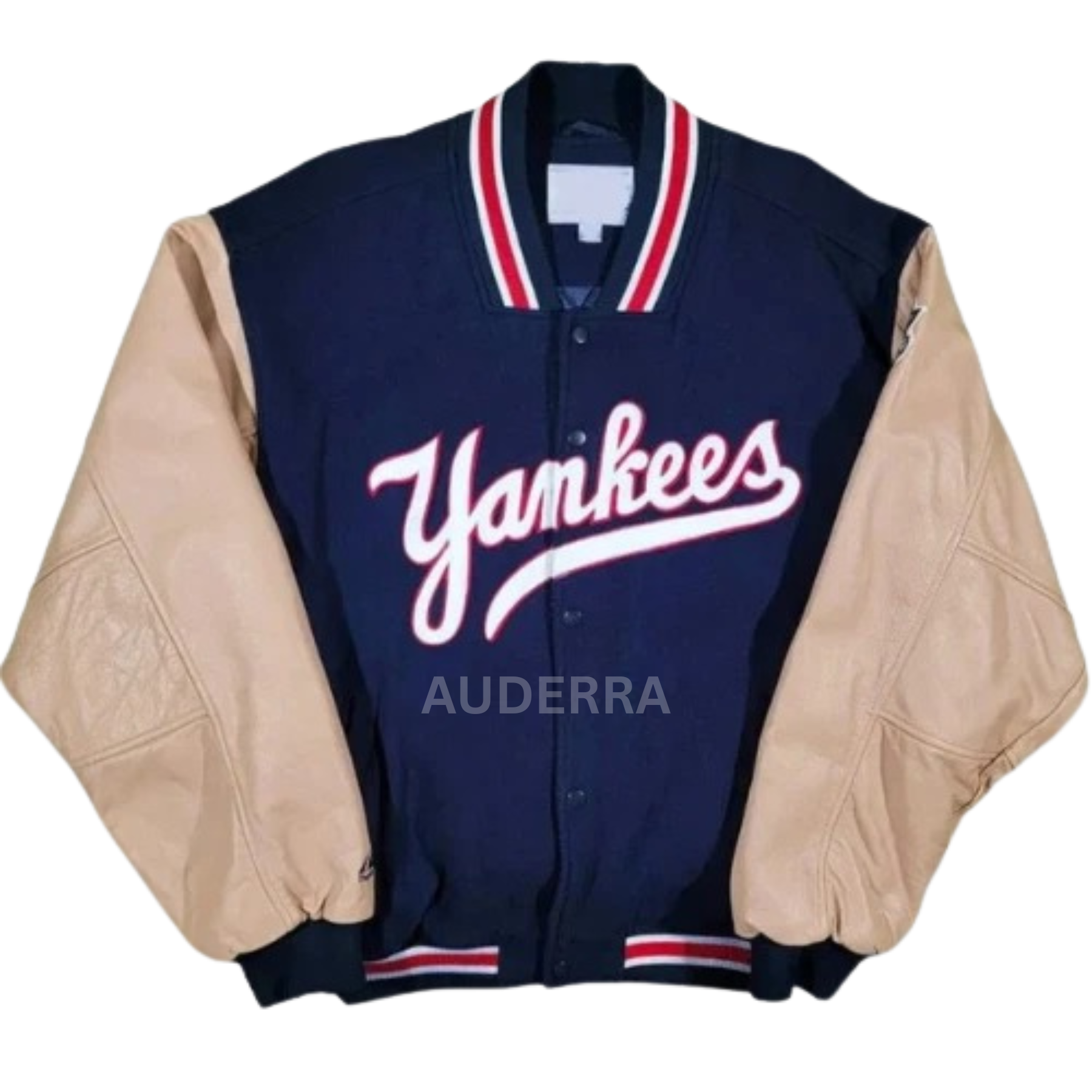 The real Cowhide & wool made exterior of this New York Yankees y2k world series varsity jacket gives you that exquisite dangling effect together with its internally tailored viscose layering.